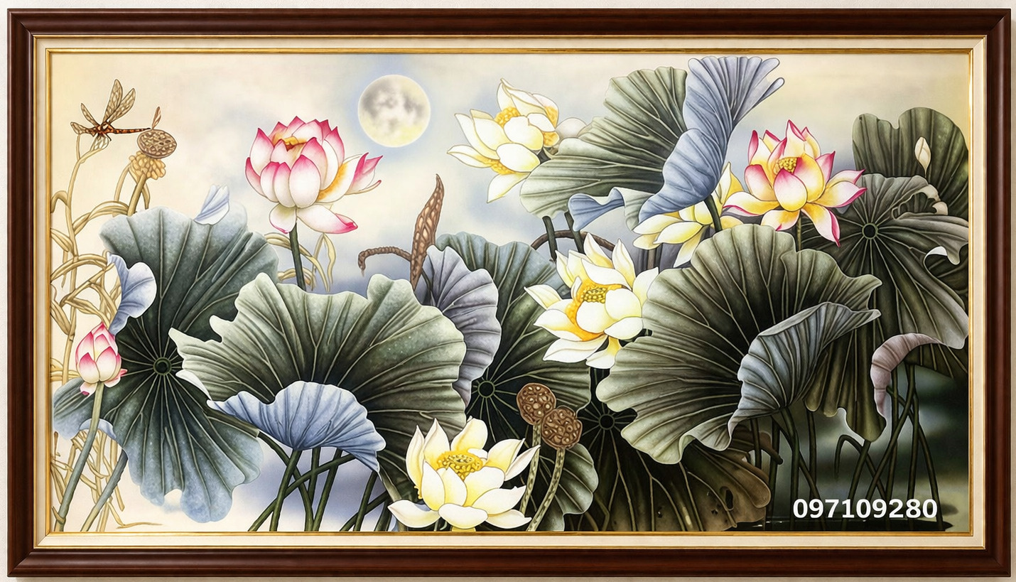 Tranh sơn dầu hoa sen thuỷ mặc cao cấp