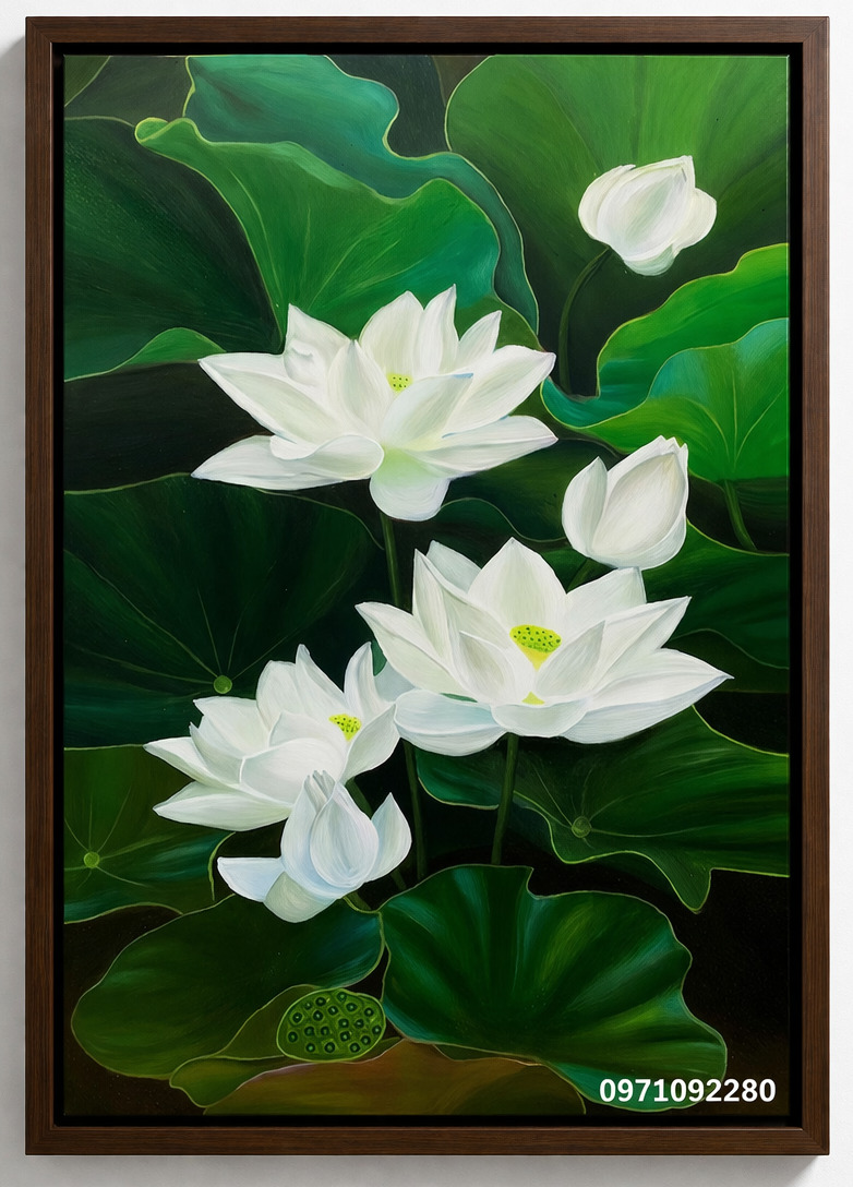 Bức tranh sơn dầu hoa sen trắng khổ dọc mang vẻ đẹp thanh khiết và trang nhã, thể hiện sự tinh tế trong từng nét vẽ thủ công của người họa sĩ. Ngay từ cái nhìn đầu tiên, bức tranh đã tạo cảm giác nhẹ nhàng, yên bình nhờ sự kết hợp hài hòa giữa sắc trắng của hoa sen và màu xanh sâu của những chiếc lá.